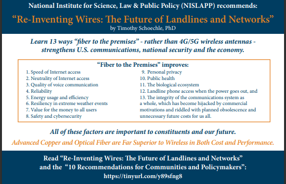Schoechle says, “Government officials have been misled about the adequacy of wireless communications. Legislators should stop enabling the wireless industry’s plans for massive new deployments of 4G LTE and soon 5G millimeter wave antennas throughout American neighborhoods, and instead commit to supporting reliable, energy-efficient and enduring hard-wired telecommunications infrastructure that meets the nation’s immediate and long-term needs.
