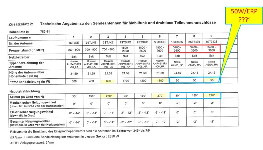 Bild oben: Zusatzblatt 2 aus dem Standortdatenblatt der Anlage Ringgenmatt in Schwarzenburg. Will doch da SALT tatsächlich mit 50Watt ERP (ERP=von der Antenne abgestrahlte Leistung) ein Dorf mit 6000 Einwohnern versorgen.(!?) Währenddem bei den 3G- und 4G-Antennen noch über 2000Watt ERP pro Sektor veranschlagt werden. Wenn die so weitermachen, haben sie bald das Perpetuum-Mobile erfunden und können bei 6G noch Energie ins Stromnetz zurückspeisen.