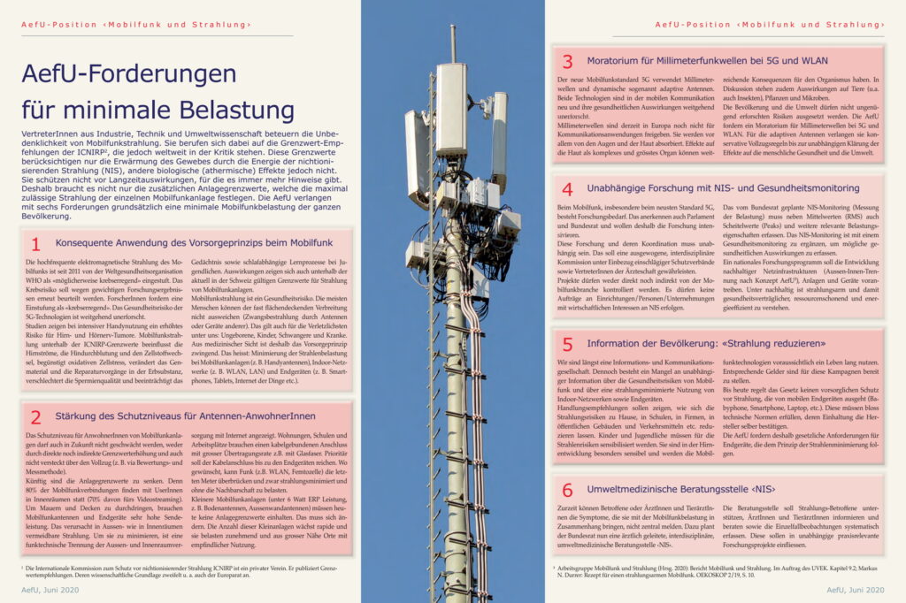 VertreterInnen aus Industrie, Technik und Umweltwissenschaft beteuern die Unbedenklichkeit von Mobilfunkstrahlung. Sie berufen sich dabei auf die Grenzwert-Empfehlungen der ICNIRP (2), die jedoch weltweit in der Kritik stehen. Diese Grenzwerte berücksichtigen nur die Erwärmung des Gewebes durch die Energie der nichtionisierenden Strahlung (NIS), andere biologische (athermische) Effekte jedoch nicht. Sie schützen nicht vor Langzeitauswirkungen, für die es immer mehr Hinweise gibt. Deshalb braucht es nicht nur die zusätzlichen Anlagegrenzwerte, welche die maximal zulässige Strahlung der einzelnen Mobilfunkanlage festlegen. Die AefU verlangen mit sechs Forderungen grundsätzlich eine minimale Mobilfunkbelastung der ganzen Bevölkerung.