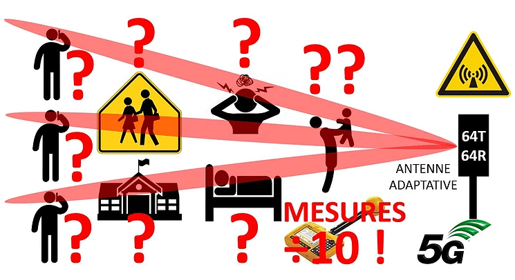 Par exemple, une antenne adaptative 5G de 10’000 W à 64 cellules, se verra gratifiée d’un facteur de division de 10, qui donnera alors une puissance calculée de 1000W seulement. Un facteur de 10 sur la puissance émise correspond à un facteur 3.16 sur l’intensité maximale du champ électrique, ce qui reviendrait à autoriser non pas 5V/m mais 5 * 3.16 = 16V/m dans les lieux d’utilisation sensibles (LUS), comme une chambre à coucher ou une salle de classe. Où est le principe de précaution ?