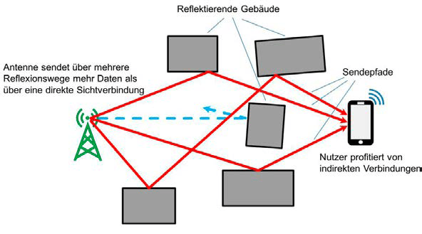 Folglich entsteht in einem urbanen, bebauten Gebiet mit zahlreichen reflektierenden Oberflächen aus den Daten-Beams und Pilotsignalen ein Strahlungsnebel, der kaum voraussagbar und variabel ist.