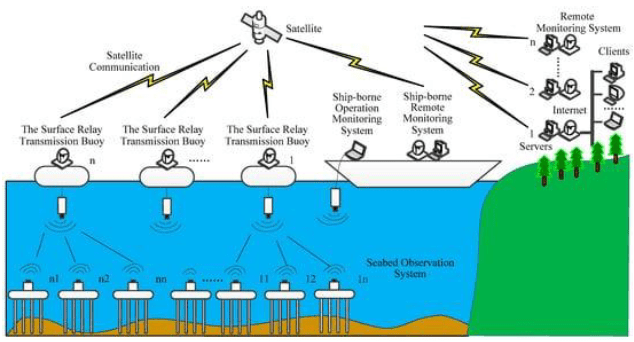 - relay antennas at different depths to transmit data vertically from the ocean floor to the ocean surface, and horizontally between nodes