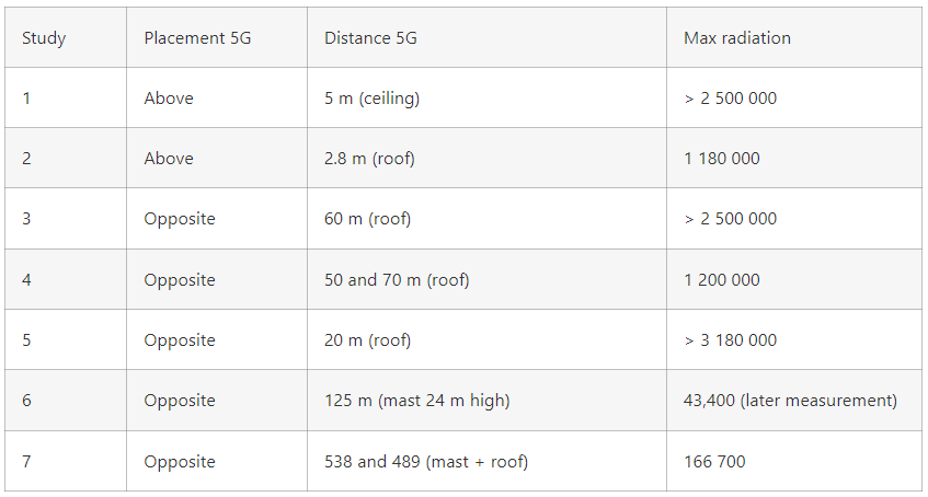 - 5G mast and 5G base station at a distance of 538 metres and 489 metres from a home where a couple in their 80s live. Maximum radiation measured in the home from the 5G masts: 166,700 μW/m2. Both studied persons developed different symptoms related to microwave syndrome to varying degrees after 5G was launched in the area. Link to article.
