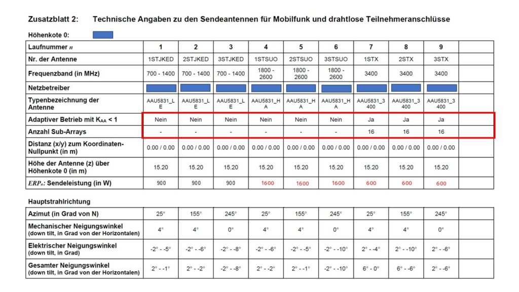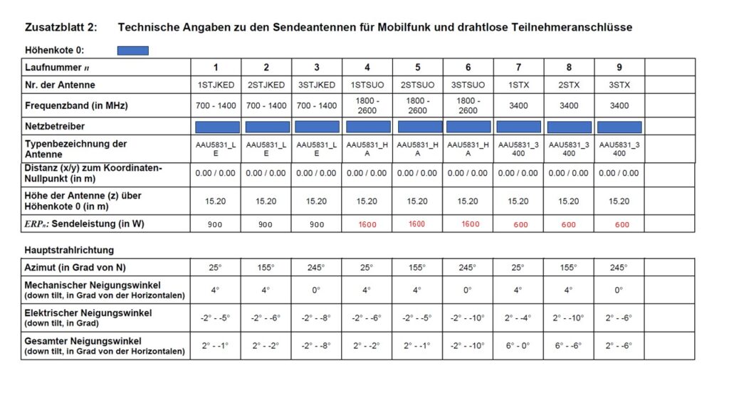 Wichtiger Hinweis: Die Bilder 1 bis 3 beziehen sich weder auf einen bestimmtem Mobilfunkbetreiber noch auf eine bestimmte Sendeanlage. Es handelt sich um Musterbeispiele mit vergleichbarer Ähnlichkeit zu realen Dokumenten, wie diese zur Zeit in den tausenden von allen 3 Mobilfunkbetreibern auf den Gemeindeverwaltungen zur Einsichtnahme aufgelegten nachträglichen Baugesuchen vorkommen. Die Bilder 1-3 zeigen das Zusatzblatt 2 aus demselben Standortdatenblatt. Die zu beachtenden Sendeparameter sind von uns rot eingefärbt und können sich in jedem Projekt leicht ändern. Die Abdeckungen auf Zeile 4 wurden von uns vorgenommen.