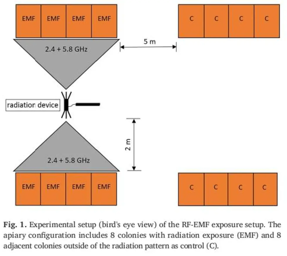 - Eine Studie der Landesanstalt für Bienenkunde an der Universität Hohenheim, die höchste wissenschaftliche Kriterien erfüllt, wies im Feldversuch ein gestörtes Heimfindeverhalten von Bienen nach, wenn diese ihr 7-wöchiges Leben lang WLAN-Strahlung ausgesetzt waren (Treder et al. (2023), Abb. 3 und 4).[12]