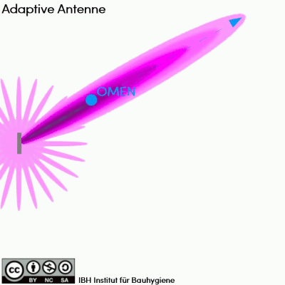 - B=Sendeverhalten einer adaptiven Antenne aus der Vogelperspektive, ca 50-fach verlangsamt. OMEN = Ort mit empfindlicher Nutzung.