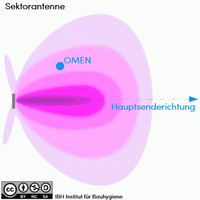 - A=Sendeverhalten einer herkömmlichen Sektorantenne aus der Vogelperspektive. OMEN = Ort mit empfindlicher Nutzung.