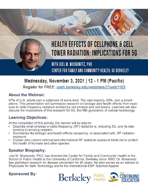 - 03 Nov 2021 – Webinar Health Effects of Cellphone (Mobile phone) & Cell Tower (Antenna) Radiation: Implications for 5G: – Webinar Registration