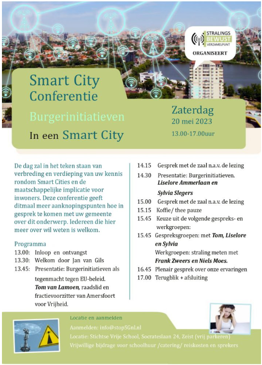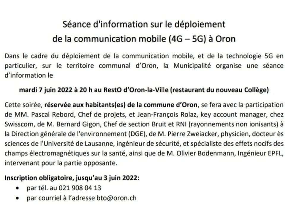 - 02 June 2022 – une soirée d’information sur la 5G à St George avec M. Olivier Bodenmann, ingénieur EPFL en génie électrique et spécialiste en électrosmog, vous présentera les aspects techniques de cette technologie, ses dangers et les alternatives possibles.