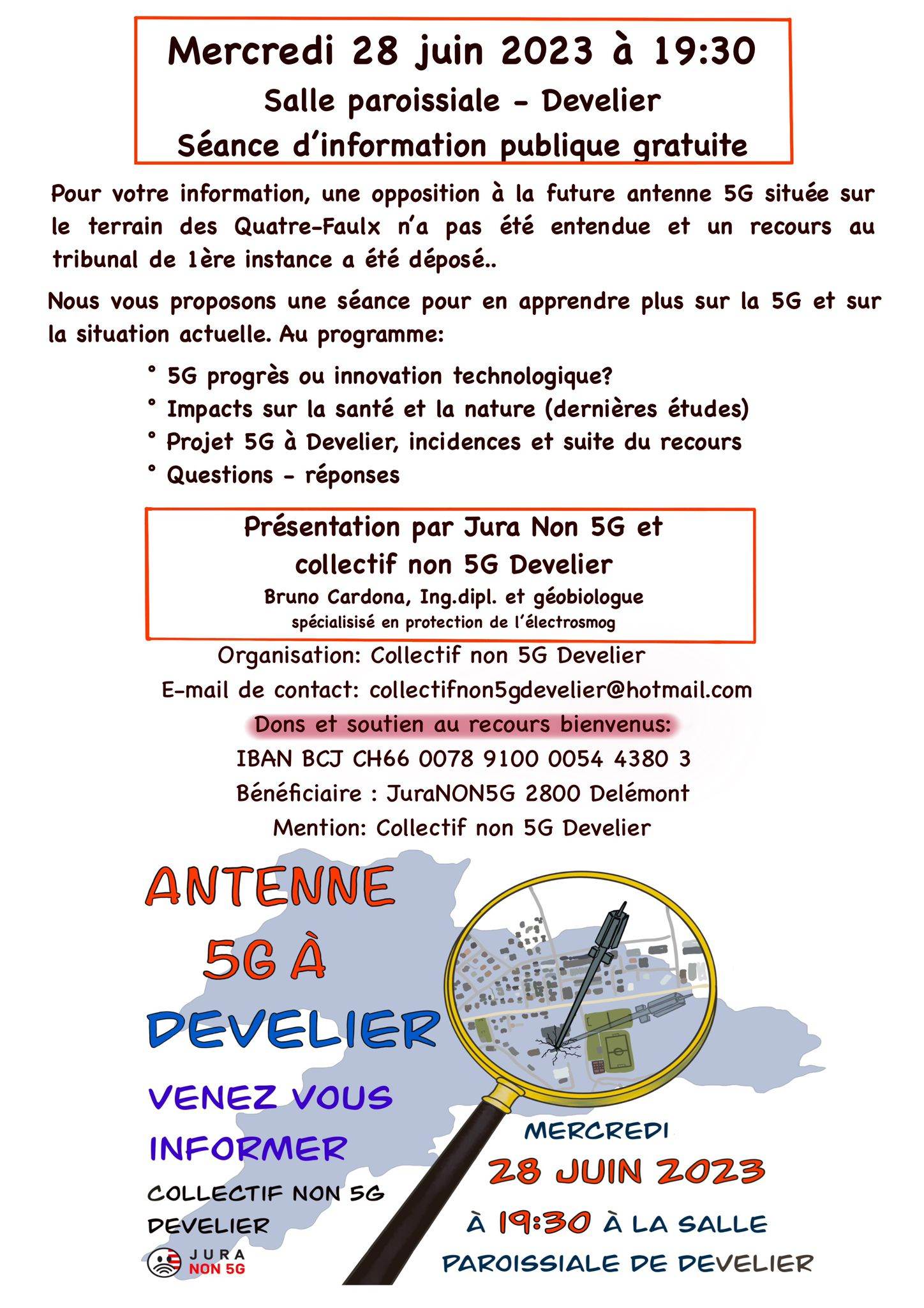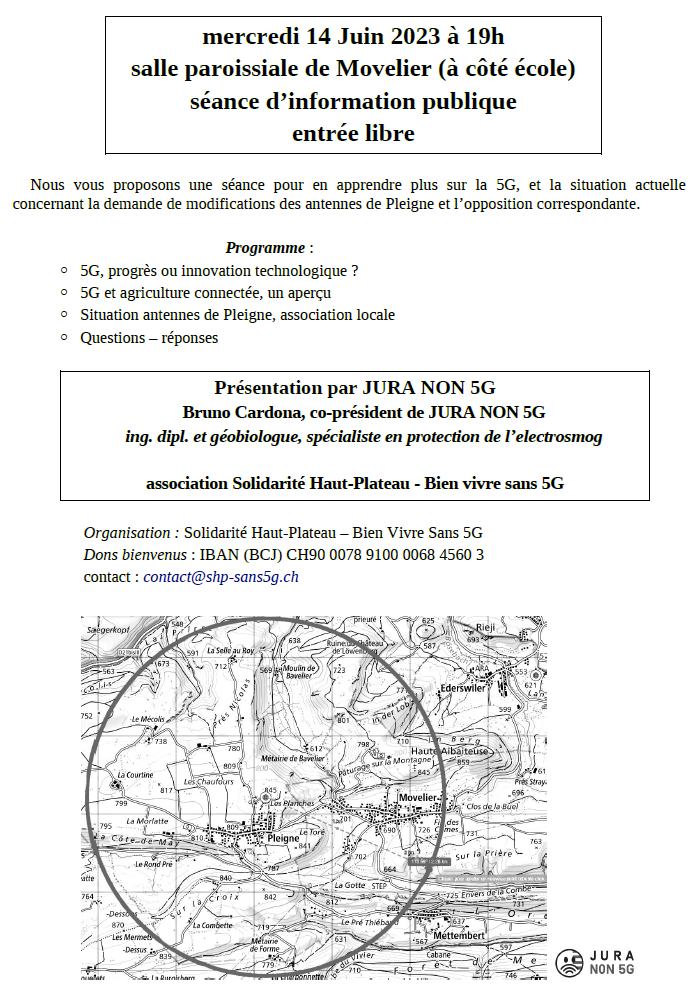 - 05 Aug 2020 – Delémont (JU) Conférence 5G – La 5G n’est pas ce qu’on vous dit ! Elle présente des risques quasi certains pour la santé, selon des études scientifiques dont nous parlerons brièvement. Nous parlerons aussi du récent rapport tant attendu de l’OFEV et de la situation actuelle. – Register here