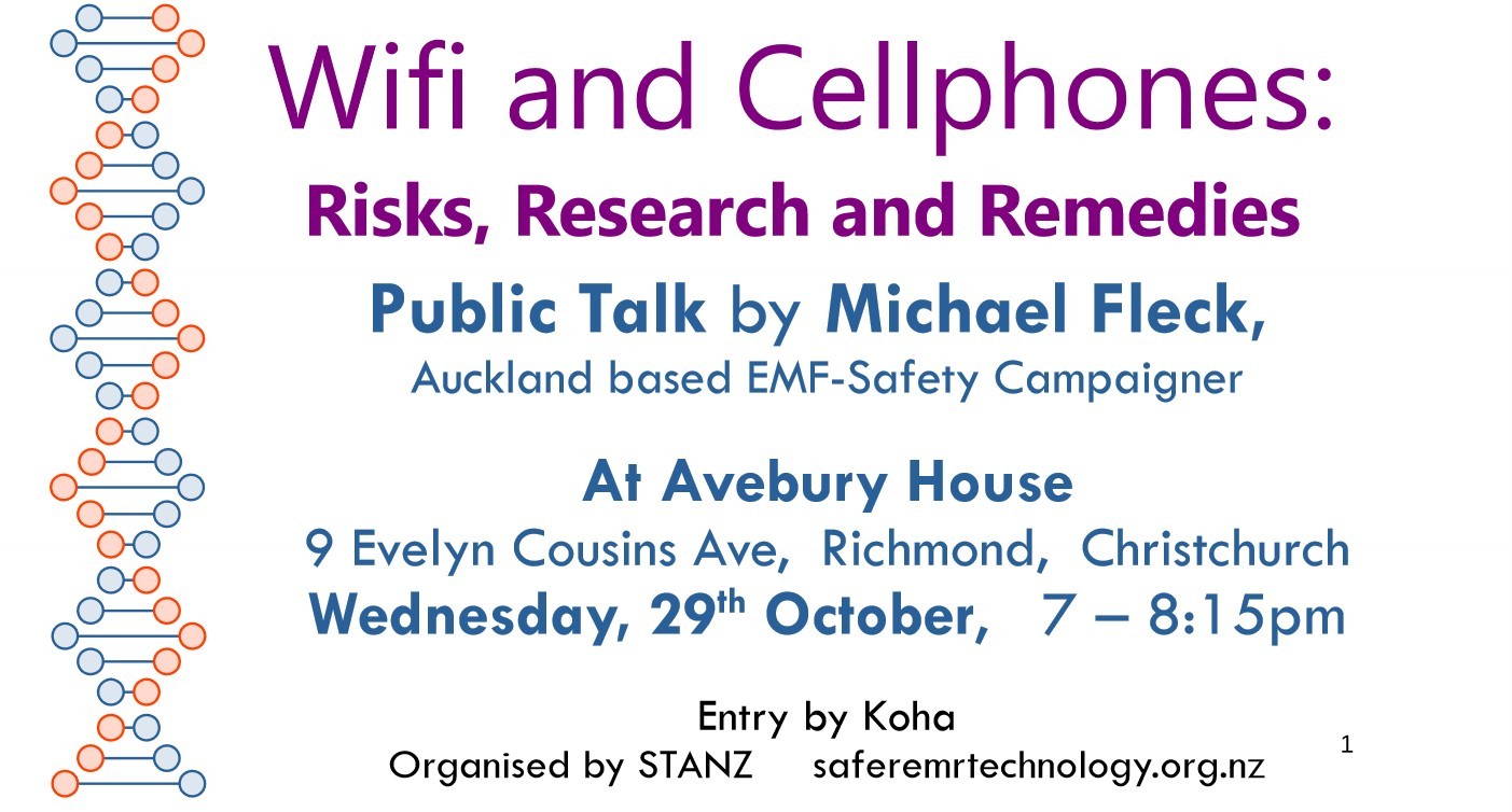- 29oct2025 – Wifi and Cellphones: Risks, Research and Remedies Public Talk by Michael Fleck Auckland NZ based EMF-Safety Campaigner – Avebury House 9 Evelyn Cousins Ave, Richmond, Christchurch – Organised by STANZ Safer Technology New Zealand