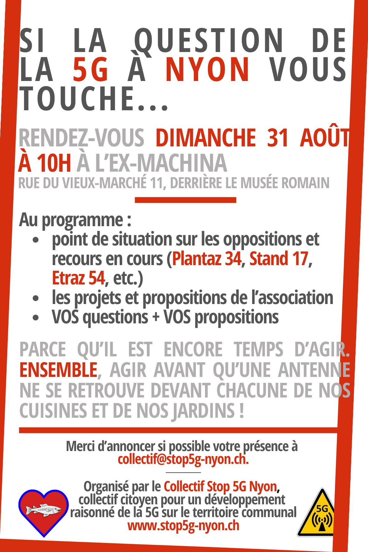 - 31aug2025 – Si la question de la 5G à Nyon vous touche… Rendez-vous 10hr à l’Ex-Machina, rue du Vieux 11, derrière le Musée Romain. Stop5G-Nyon