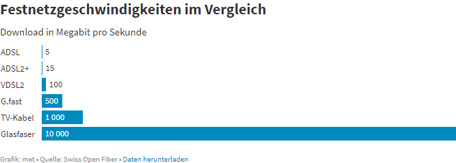- Swisscom has also been installing a technology called “G-Fast” over exisiting copper lines, which may increase download speeds up to 500Mbits/s. However G.fast speeds rapidly diminish with distance (max 500meters).