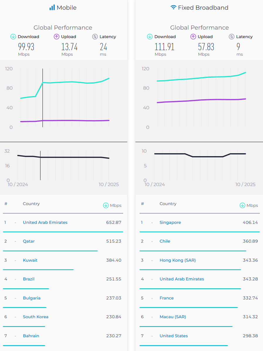 Switzerland ranked 35th for Mobile and 12th for Fixed Broadband – Oct 2025