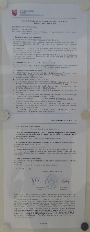 Le PV de la réunion du CC, 5 mai 2022 a été publié sur le site levaud ch extraits de proces verbaux. Voici une copie du document: cf. point 3 – paragraphe 4 – 23mai2022